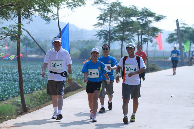 11月5日,秋陽(yáng)燦爛,大家早已躍躍欲試,隊(duì)中負(fù)責(zé)后勤的我,早在比賽前夕就廣發(fā)注意帖:速干短褲、帽子、腰包、水杯、小方巾、鞋子等物品需必備;作為隊(duì)伍領(lǐng)頭雁的齊總則早已咨詢專業(yè)選手,提倡大家結(jié)合自己體力準(zhǔn)備能量棒、巧克力等緊急能量品;隊(duì)長(zhǎng)鄧總在了解路線和路況后,制定了“穩(wěn)重取勝”的戰(zhàn)略,采取了“準(zhǔn)備活動(dòng)做充足,先慢后快求適應(yīng),不因外因亂陣腳,敵疲我追求成績(jī)”的具體戰(zhàn)術(shù);隊(duì)伍中的另一名隊(duì)員則帶來(lái)了他專業(yè)的GPS定位手表,分時(shí)段匯報(bào)所走路程、當(dāng)前速度適當(dāng)與否,并提前告知提速準(zhǔn)備;我們的女隊(duì)友亞梅,則一路保持微笑,緊跟隊(duì)伍,偶爾爆出的一些冷笑話,讓緊張趕路的我們倍感清爽。