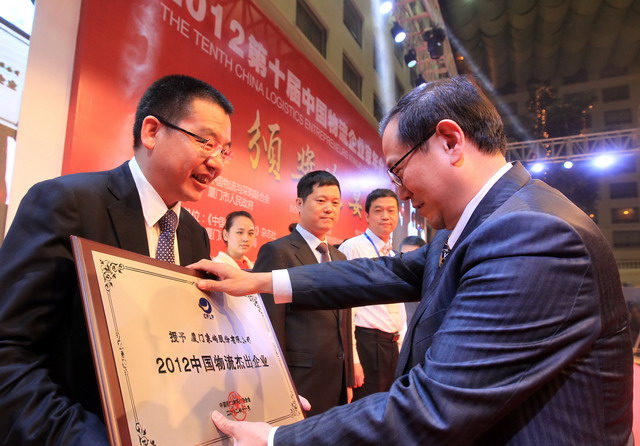 2012中國(guó)物流杰出企業(yè)頒獎(jiǎng)現(xiàn)場(chǎng),廈門象嶼股份有限公司榮獲“2012中國(guó)物流杰出企業(yè)”稱號(hào)