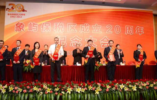 11月28日上午,在慶祝廈門象嶼保稅區(qū)成立20周年的喜慶日子里,廈門市委、市政府隆重舉行慶祝大會(huì),回顧保稅區(qū)20年的奮斗歷程,總結(jié)保稅區(qū)20年的發(fā)展經(jīng)驗(yàn),展望保稅區(qū)更加美好的發(fā)展未來(lái)。為保稅區(qū)建設(shè)立下汗馬功勞的10家突出貢獻(xiàn)企業(yè)和10位突出貢獻(xiàn)個(gè)人受到了隆重表彰。其中,廈門象嶼集團(tuán)有限公司、廈門象嶼股份有限公司榮獲突出貢獻(xiàn)企業(yè),象嶼集團(tuán)黨委書記、董事長(zhǎng)王龍雛,象嶼建設(shè)集團(tuán)常務(wù)副總經(jīng)理王澍陶榮獲突出貢獻(xiàn)個(gè)人。
