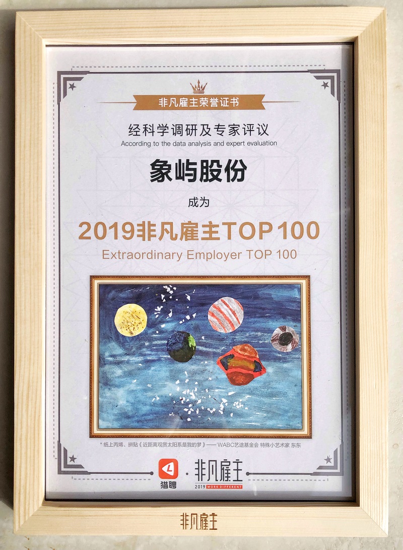 12月13日,由國內精英職業(yè)發(fā)展平臺獵聘網主辦的2019非凡雇主“非凡之夜頒獎盛典”在廣州舉行。象嶼股份從上萬余家企業(yè)中脫穎而出,入選“2019非凡雇主TOP 100” 及“2019福建變革非凡雇主”。