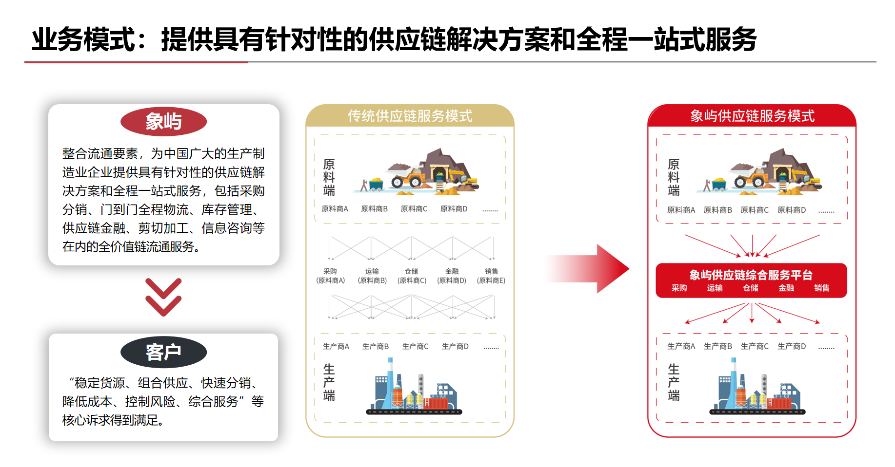 豐富多元、成熟穩(wěn)定的全球化業(yè)務(wù)渠道體系;覆蓋全國、連接海外的網(wǎng)絡(luò)化物流服務(wù)體系;正在構(gòu)建、初步成型的智能化信息科技體系;準(zhǔn)確識別、日趨完善的全面風(fēng)險管控體系;市場化、專業(yè)化的供應(yīng)鏈服務(wù)團隊。