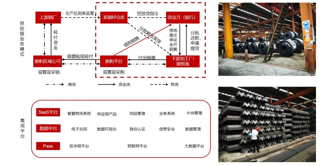 象嶼股份作為供應鏈核心企業(yè),借助IOT(物聯(lián)網(wǎng))、區(qū)塊鏈、AI等技術(shù),圍繞塑化、鋁產(chǎn)品、鋼材等產(chǎn)品進行倉單質(zhì)押融資,通過數(shù)字化建設(shè),輔助背書客戶資信、貨權(quán)監(jiān)管和輔助銷售,獲取資金方的認可,幫助中小微企業(yè)客戶增信,解決中小微企業(yè)融資難的問題。目前象嶼智慧物流平臺已獲得建行總行、普洛斯等多家金融機構(gòu)數(shù)字化監(jiān)管倉準入,《人民日報》等媒體也作了專題報道。