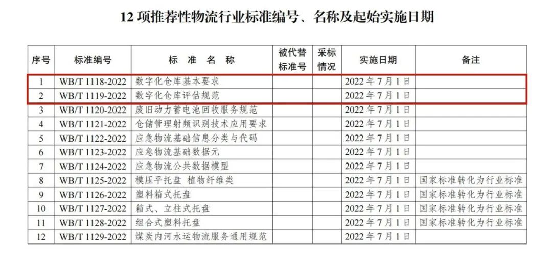 近日,中華人民共和國(guó)國(guó)家發(fā)展和改革委員會(huì)印發(fā)了2022年第6號(hào)公告,批準(zhǔn)發(fā)布12項(xiàng)推薦性物流行業(yè)標(biāo)準(zhǔn)。其中,由廈門象嶼股份有限公司參與編寫的《數(shù)字化倉庫基本要求》(WB/T 1118-2022)《數(shù)字化倉庫評(píng)估規(guī)范》(WB/T 1119-2022)2項(xiàng)推薦性物流行業(yè)標(biāo)準(zhǔn)于2022年7月1日正式實(shí)施。
