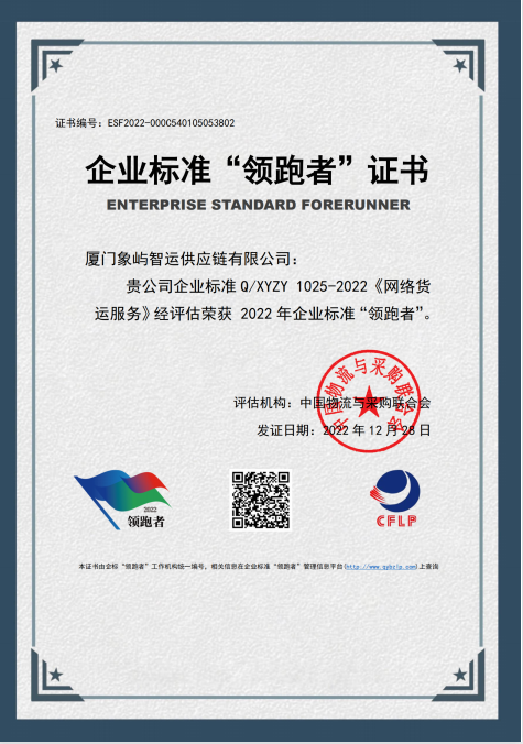 近日,“企業(yè)標(biāo)準(zhǔn)領(lǐng)跑者管理信息平臺”正式發(fā)布“物流服務(wù)”領(lǐng)域首批企業(yè)標(biāo)準(zhǔn)“領(lǐng)跑者”企業(yè)名單。象嶼股份旗下廈門象嶼智運(yùn)供應(yīng)鏈有限公司憑借高水平的網(wǎng)絡(luò)貨運(yùn)服務(wù)質(zhì)量,良好的服務(wù)信譽(yù)以及扎實的企業(yè)管理體系,榮膺首批網(wǎng)絡(luò)貨運(yùn)服務(wù)“領(lǐng)跑者”。